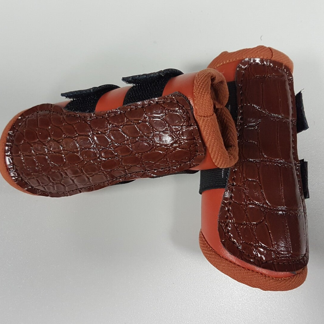 Deze beschermers zijn van kunstleer en kunnen in diverse kleuren en maten besteld worden. Ook de afwerking van het klittenband kan gekozen worden.