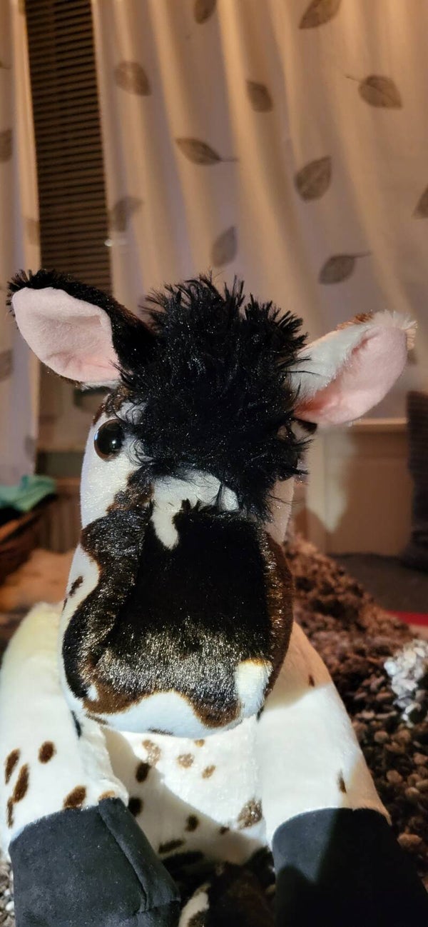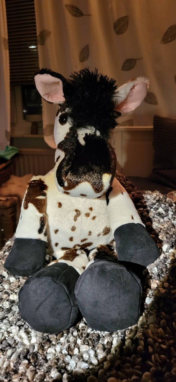 Deze paardenknuffel is gemaakt van kortharig bont. Dit materiaal voelt lekker warm en zacht aan