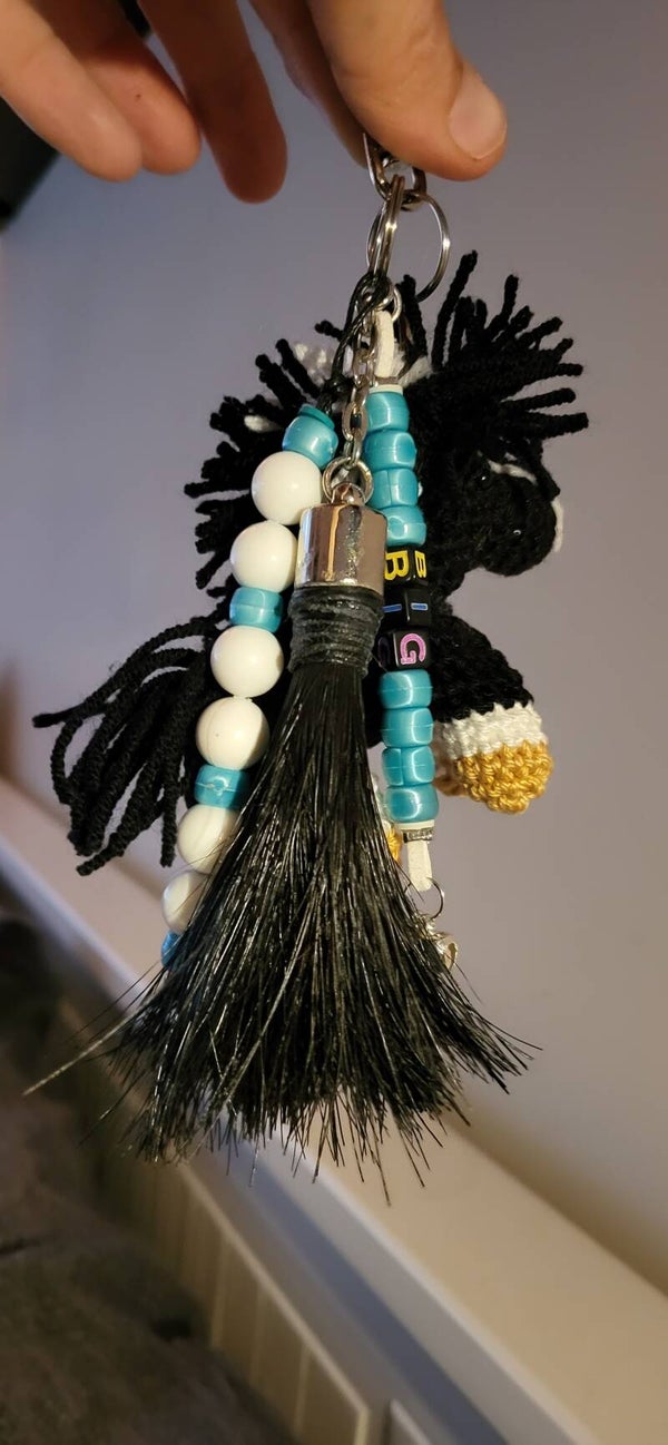 Deze staande sleutelhanger is handgemaakt.Het wordt nagemaakt aan de hand van foto's van jouw paard/pony en wordt verder aangekleed met kralen en andere accessoires in de door jou gekozen kleur